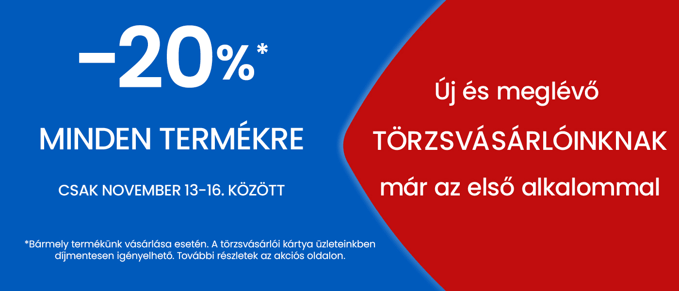 Az akció időszaka alatt törzsvásárlóink számára 20% kedvezményt biztosítunk minden termékünk teljes fogyasztói árából abban az esetben, ha vásárláskor felmutatják saját törzsvásárlói kártyájukat vagy az akció időszaka alatt üzletünkben csatlakoznak a törzsvásárlói programunkhoz.